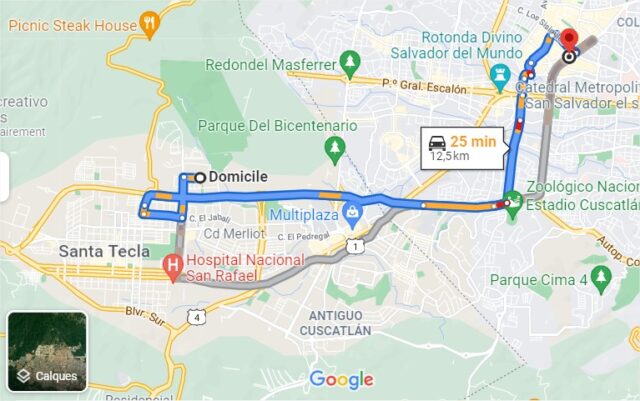 Et je vais chercher la voiture de location dans le centre de San Salvador, heureusement Google map fonctionne bien et même au Salvador :