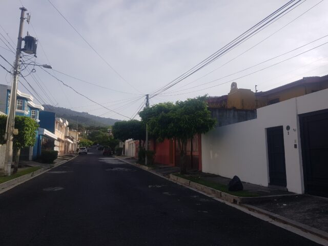 Notre rue avec notre maison à droite, la rue est résidentielle et hyper protégée (garde à l’entrée de la résidence, un vigile à chaque coin de rue).