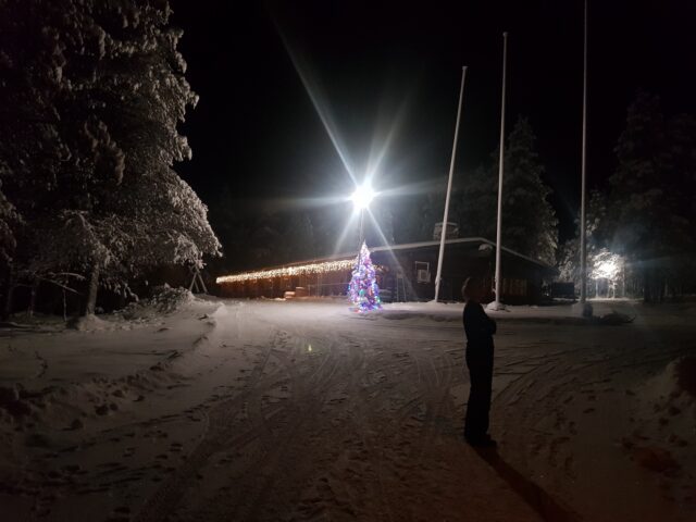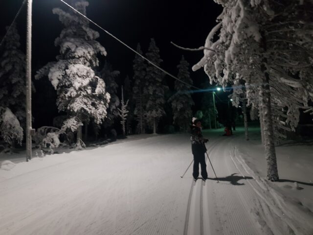 Puis c’est le retour au chalet en pleine nuit évidemment, mais les Finlandais habitués à ne pas avoir trop de soleil éclairent largement les pistes de skis de fond et les pistes de randonnée.
