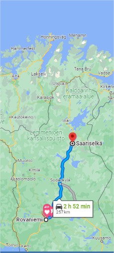 Nous partons de la latitude 66° qui correspond au cercle polaire pour atteindre Saariselka qui est à 68°C soit 2400km du pôle nord et tout près de la frontière russe (47km)