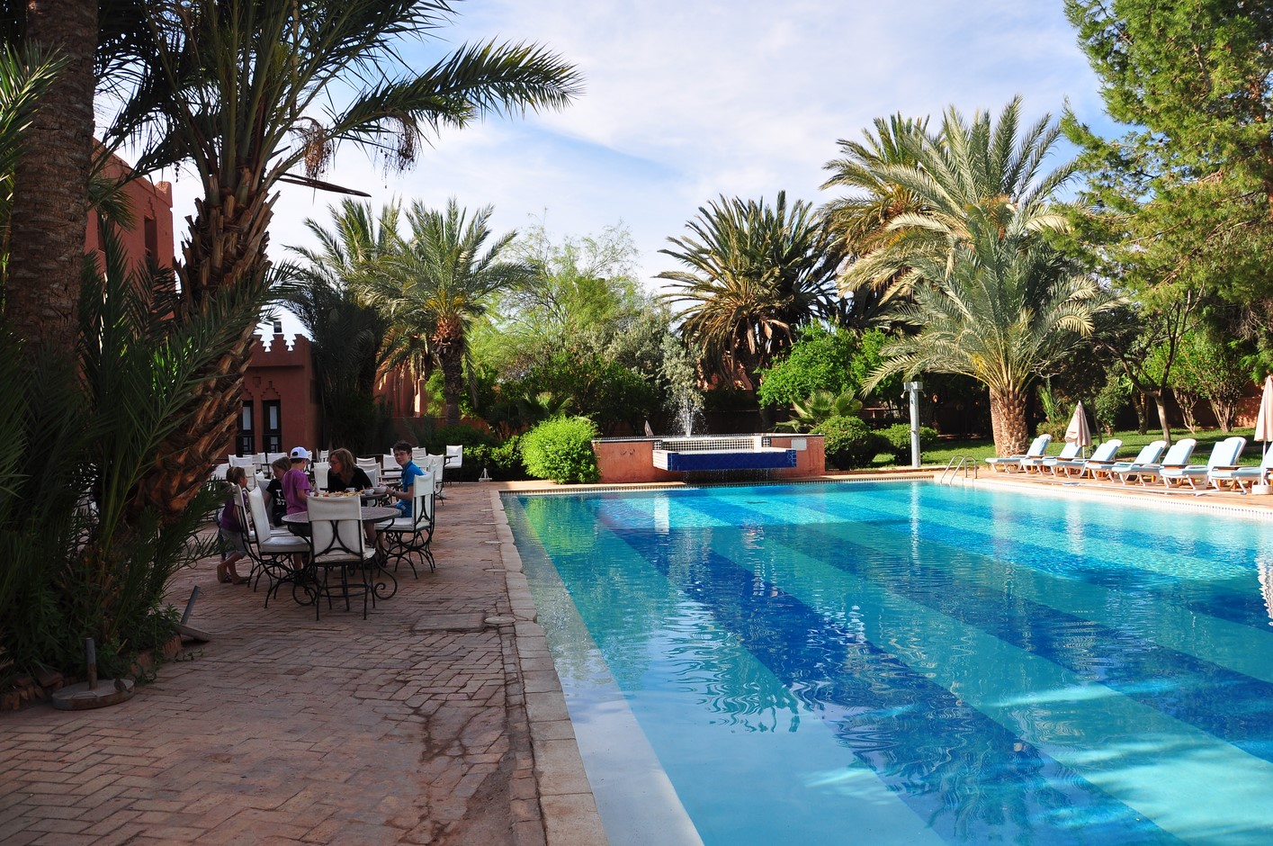 Vers 16h30 on repart vers Zagora tout le monde prend un peu le volant les enfants aussi. On profite des dernières couleurs sur le Draa avant d’arriver à Zagora. Nous voici « chez ali » c’est pas mal surtout le jardin avec la piscine Re.Rebaignade