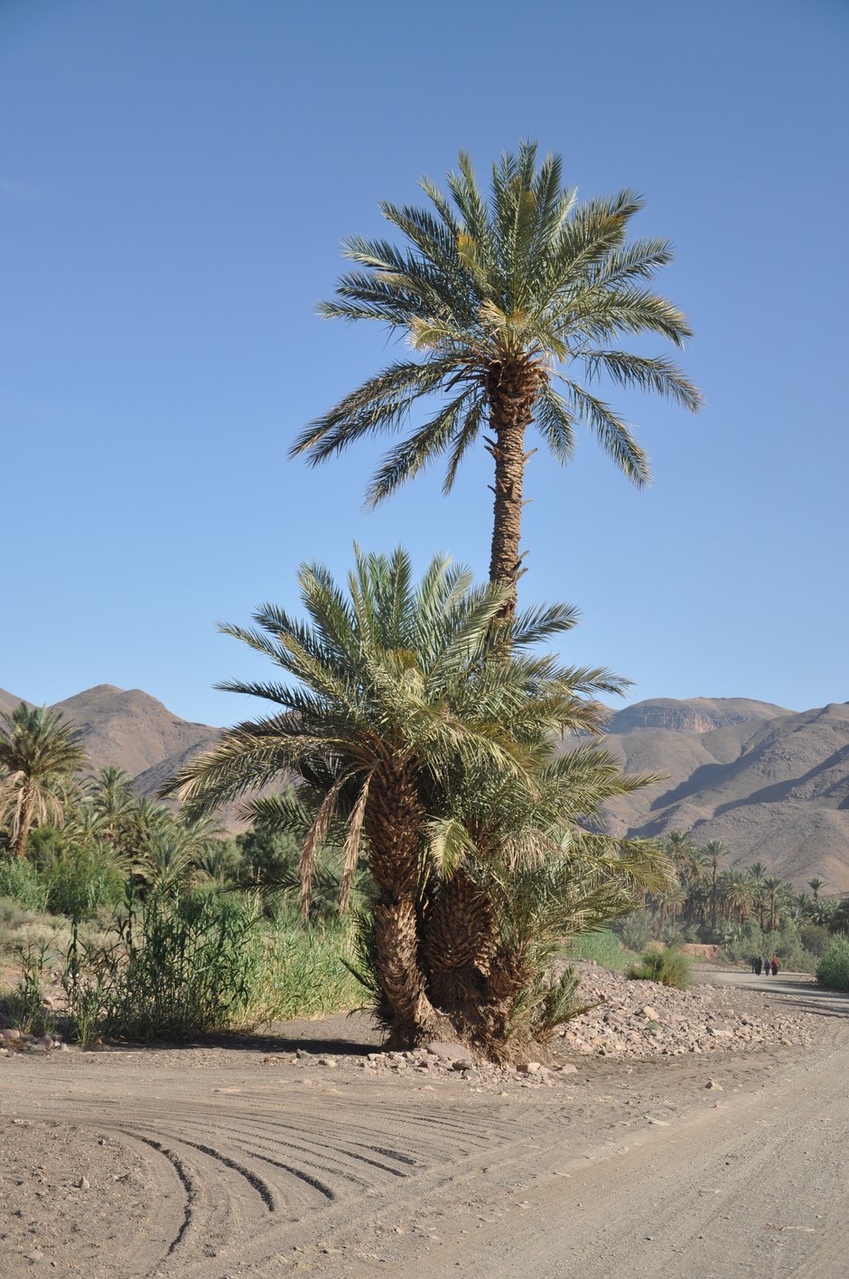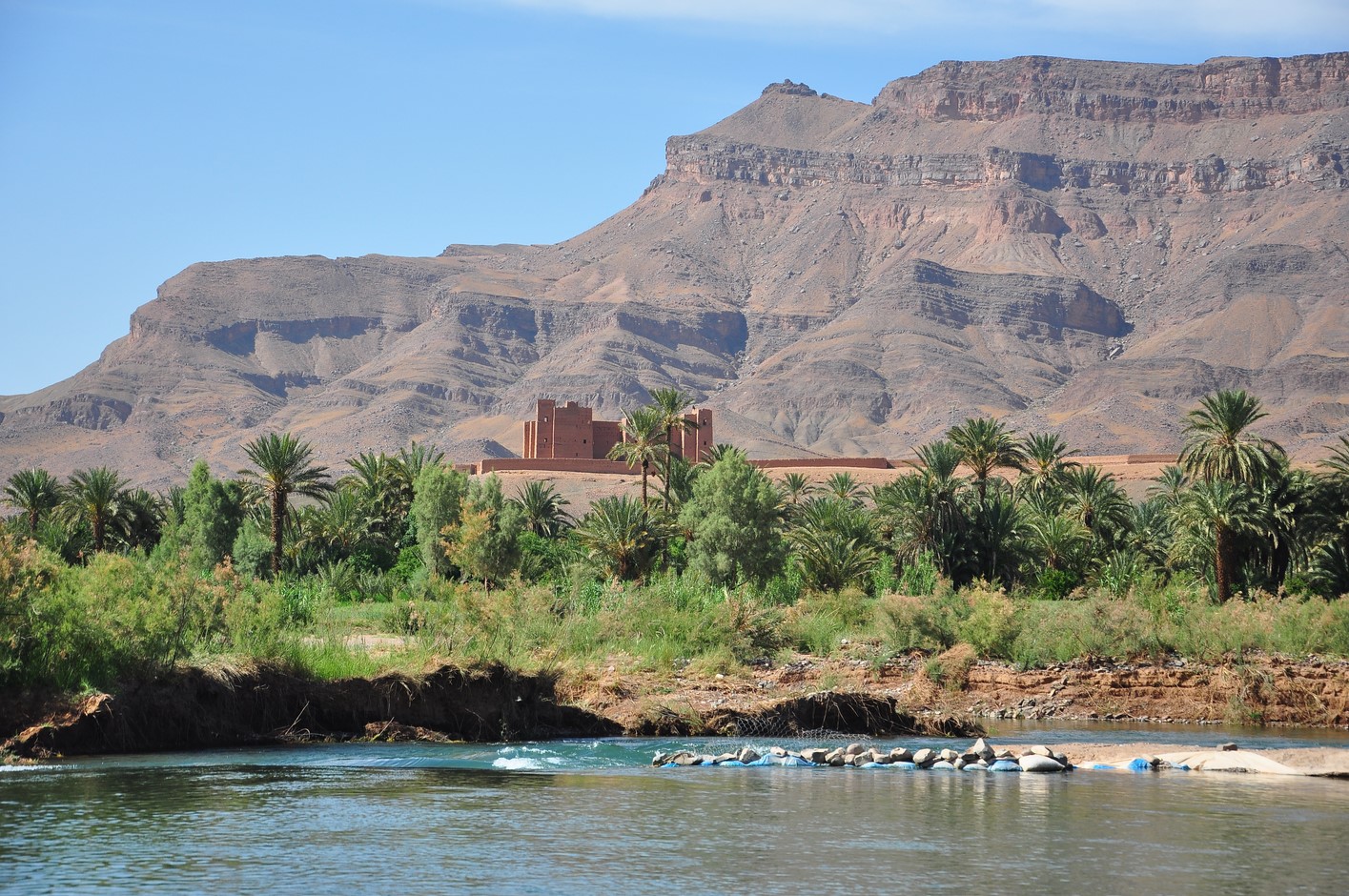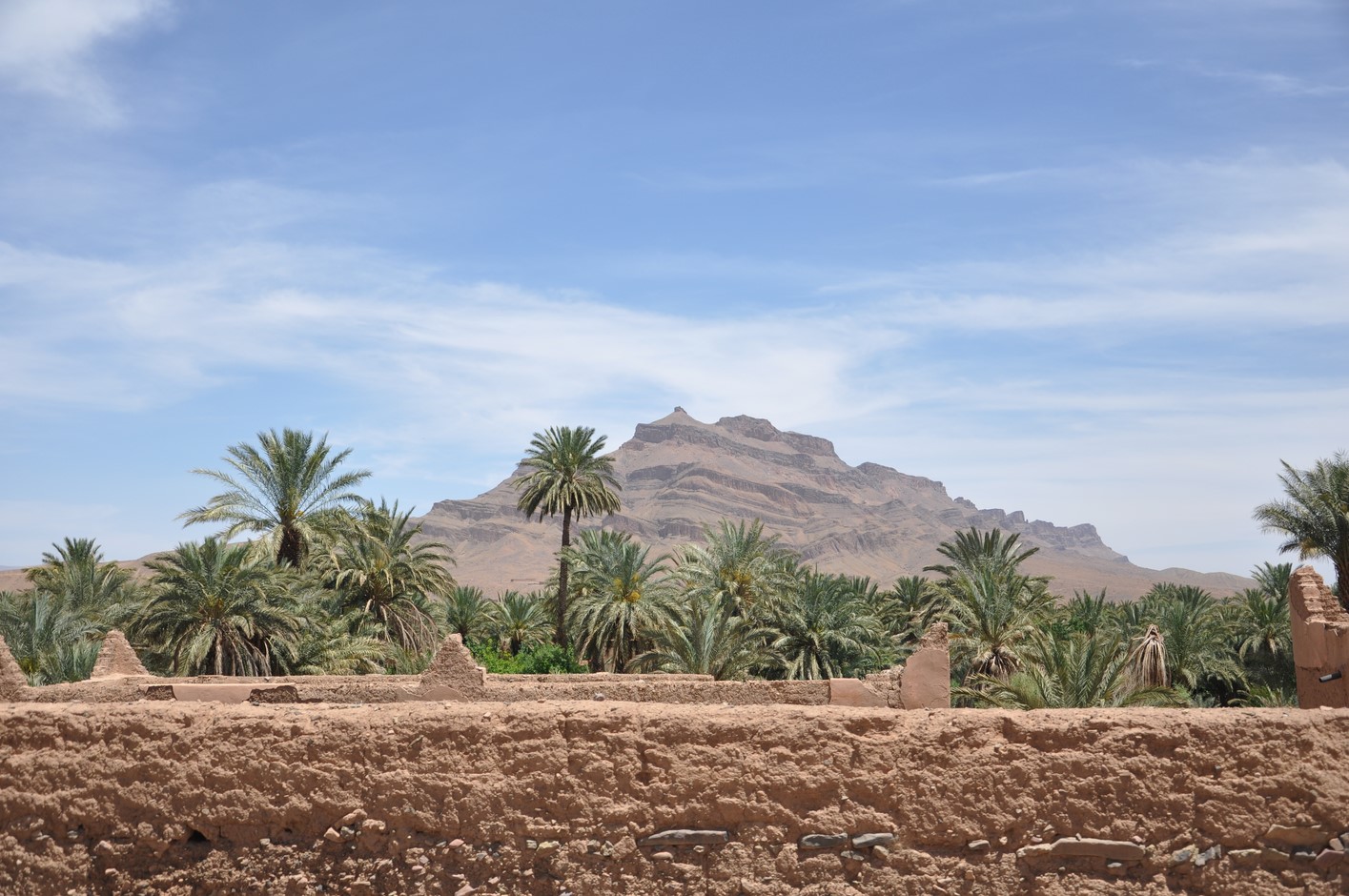 C’est parti vers 12H Et on parcourt les 60km vers le Draa, la route est quelconque on arrive à Agdz vers 13h30 là on quitte la route et passons dans la palmeraie, c’est très joli et ce sont nos premières pistes, les palmiers palmiers et encore palmiers sont toujours photogéniques et s’allient parfaitement avec la terre rouge.