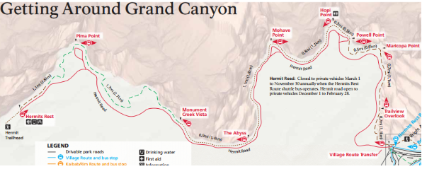 On prendra une suivante à Trailview Overlook jusqu’à Hermit’s Rest et on reviendra à pied pour voir le coucher de soleil à Hopi.