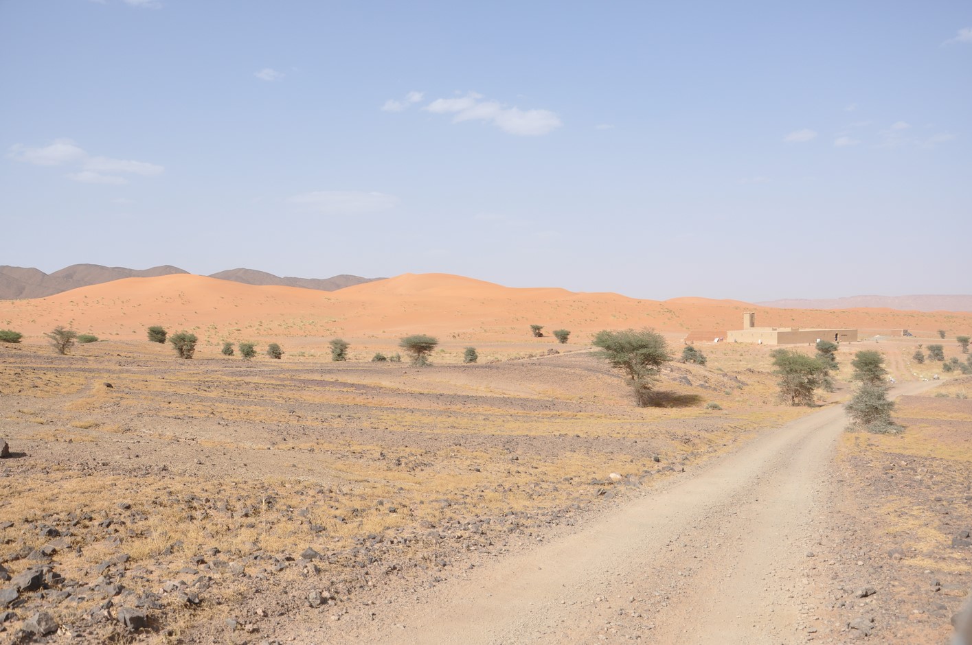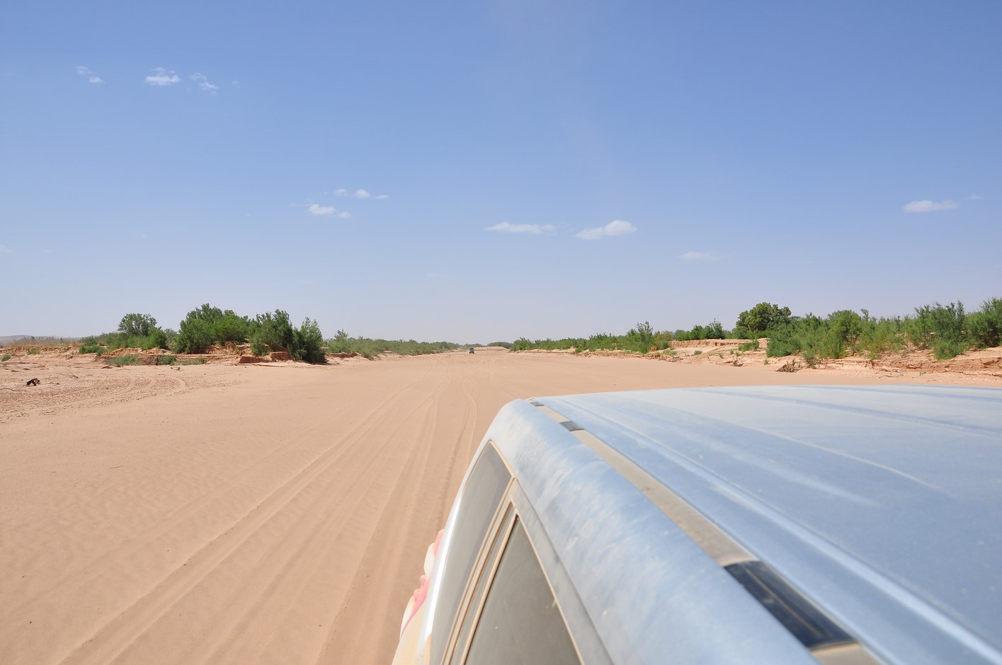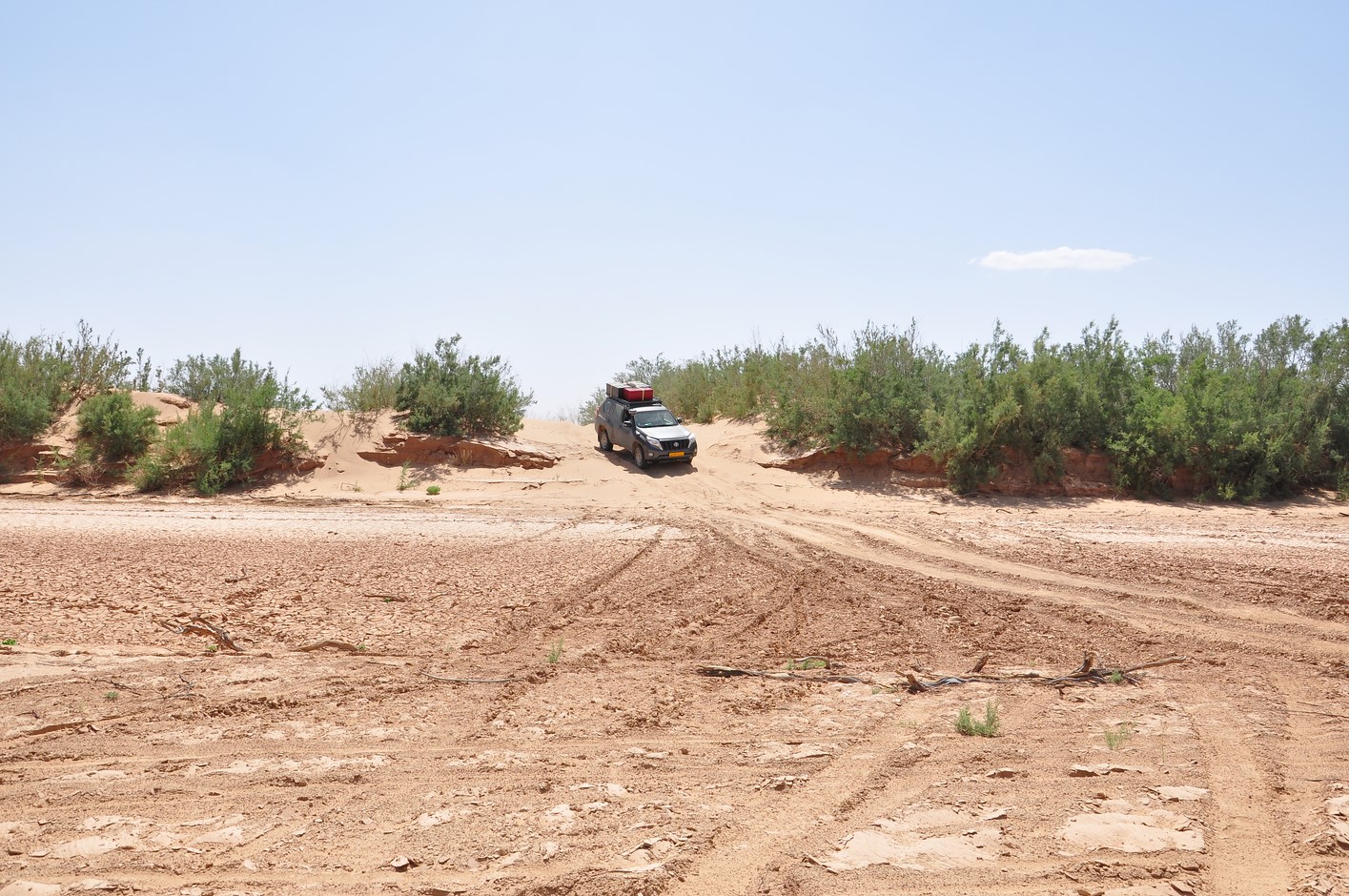 La route reprend toujours aussi belle, on atteint une petite difficulté dans un Oued à sec très sablonneux je me trompe de route et nous devons faire demi tour après 400m dans du sable tout mou, finalement sans dégonfler on ne s’ensablera pas et reprendrons la route.