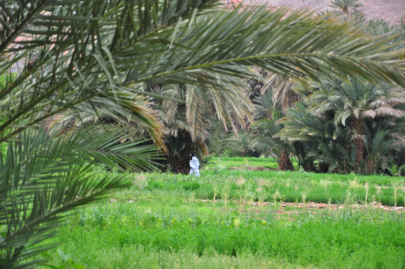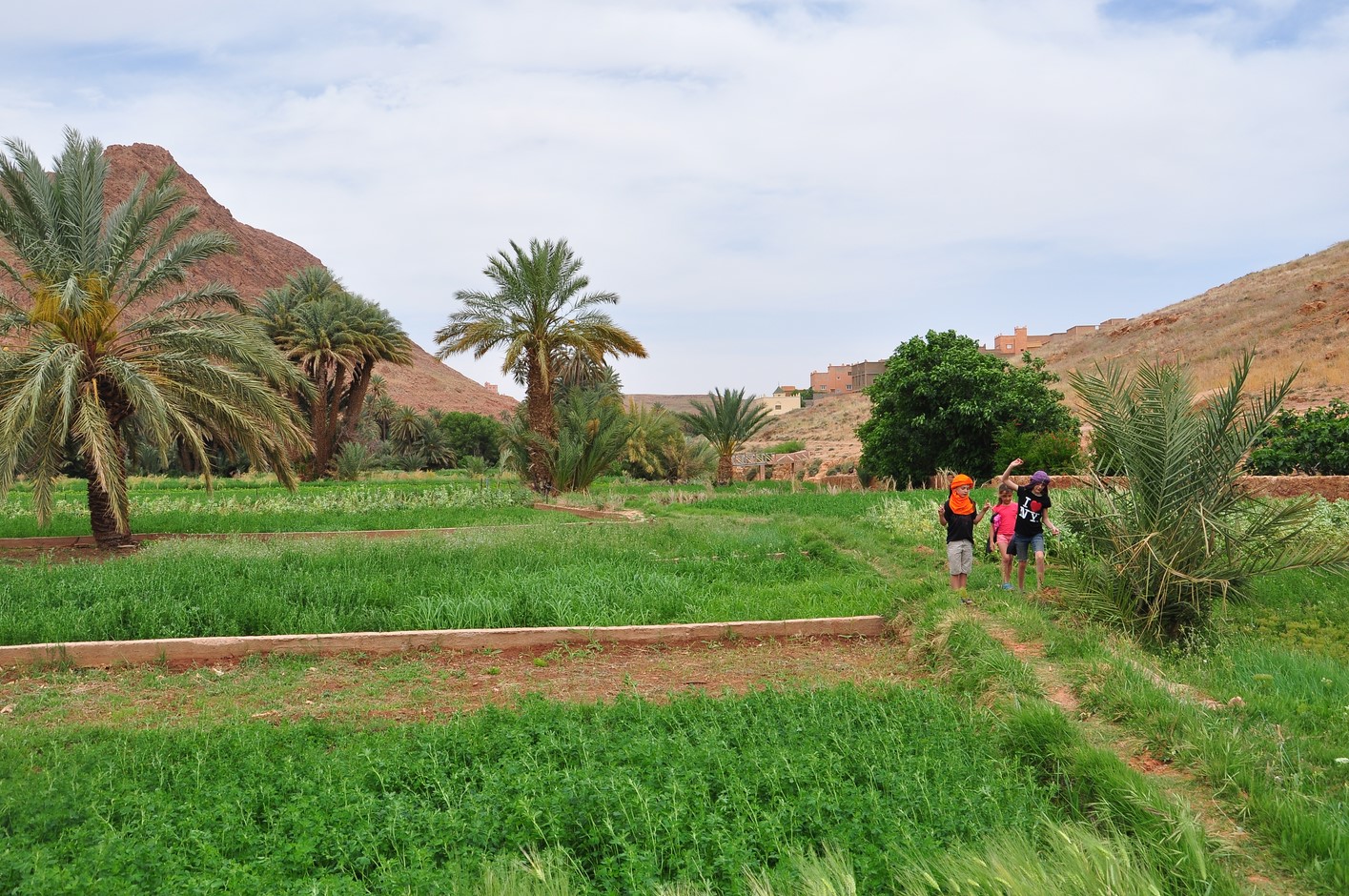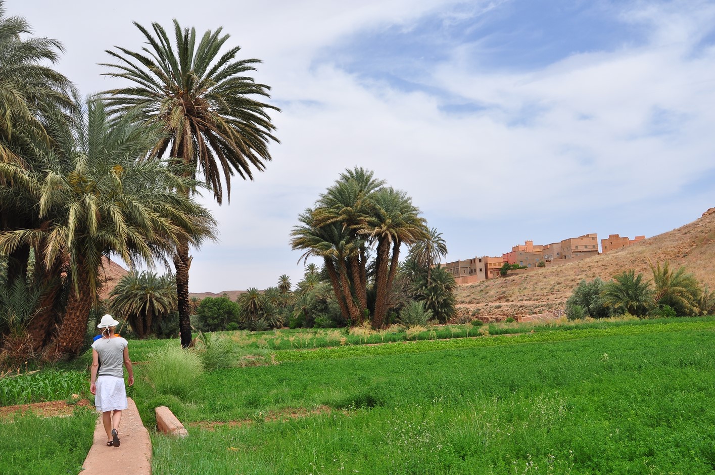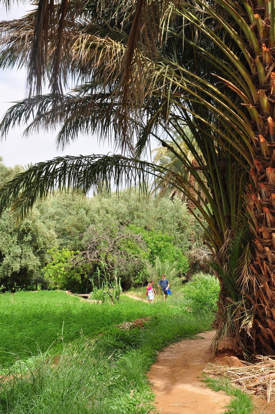 Puis ballade à pieds dans la palmeraie ; c’est très verdoyant et la multitude de palmiers est très photogénique.