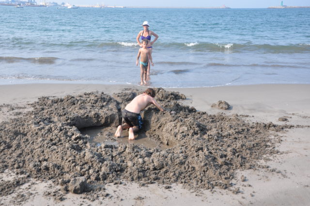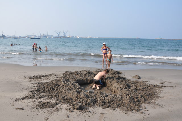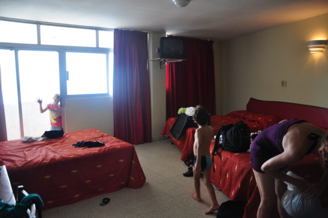 Donc on trouve un hotel avec vue sur la mer, les enfants en profitent pour jouer dans le sable avec une plage et une eau aussi limpide que sur les plages charantaises , il est absolument hors de question que nous y trempions les pieds.