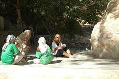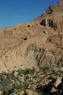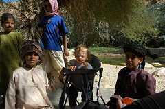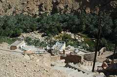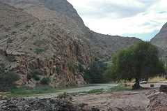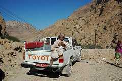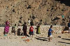 On aperçoit à flanc de montage un petit village que nous rejoindrons par une descente dangereuse 15mn plus tard. Nous devrons laisser les 4*4 et finir le chemin à pied pour parvenir dans ce petit paradis. 22.776447N 59.225032E